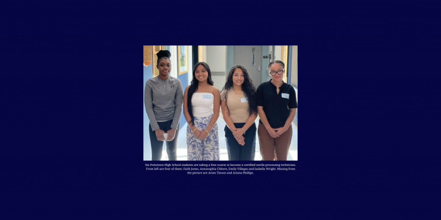 Six Pottstown High School students are taking a free course to become a certified sterile processing technician. From left are four of them: Faith Jones, Annasophia Chhern, Emily Villegas and Isabella Wright. Missing from the picture are Arian Tinson and Ariana Phillips. (Image courtesy of Foundation for Pottstown Education) POTTSTOWN — A certification course in a sterile processing technician program is …
